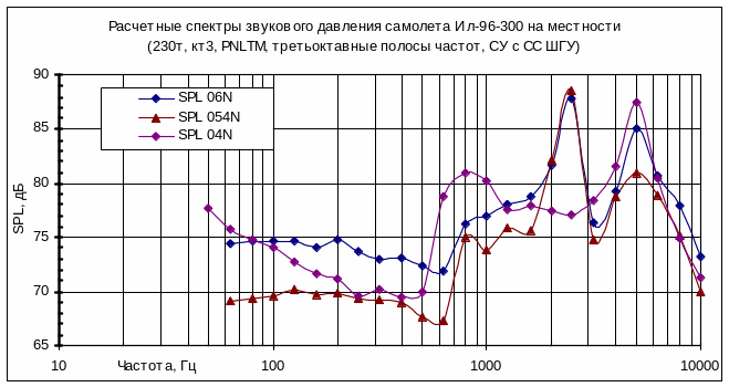 Таким образом спектр уровней звукового давления в третьоктавных полосах частот, соответствующий максимальному уровню воспринимаемого шума на местности, позволяет определить источники наиболее интенсивного акустического излучения силовой установки самолета для направления излучения наибольшей шумности. Для современных магистральных самолетов с системами шумоглушения в силовой установке на режимах взлета и набора высоты наиболее интенсивным источником акустического излучения является реактивная струя, имеющая непрерывный по частоте спектр излучения. На режиме захода на посадку спектр излучения силовой установки является комбинированным, а наиболее интенсивными источниками излучения являются реактивная струя (излучение с непрерывным по частоте спектром) и лопаточные машины двигателя (излучение отдельных тонов на частотах следования лопаток рабочих колеи и их гармониках).