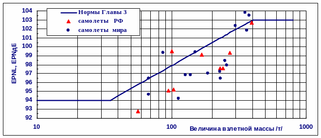 Статистическая оценка величины “EPNL” как интервальная оценка математического ожидания случайной величины является представительной величиной, которая может служить для определения степени соответствия акустических характеристик самолета действующим нормативным ограничениям на взлетно-посадочных режимах полета. На рисунке 4.1 пример оценки соответствия уровней шума магистральных самолетов нормам Главы 3 стандарта ИКАО в контрольной точке на местности, расположенной сбоку от оси ВПП.