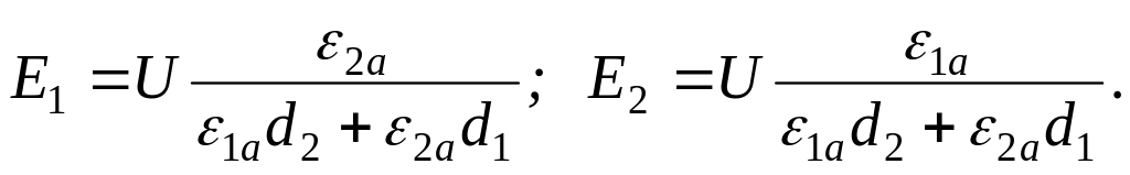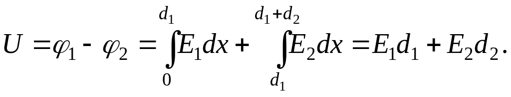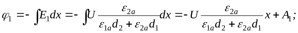 Постоянную интегрирования А1 определим из условия, что при х=0 φ1=U (А1=U), а А2 – из условия, что при х=d1 φ1=φ2 (или φ2=0 при х=d1+d2). Из полученных формул видно, что потенциал изменяется по линейному закону. На рис.11.21 показаны графики зависимости от х индукций, напряженностей и потенциалов.