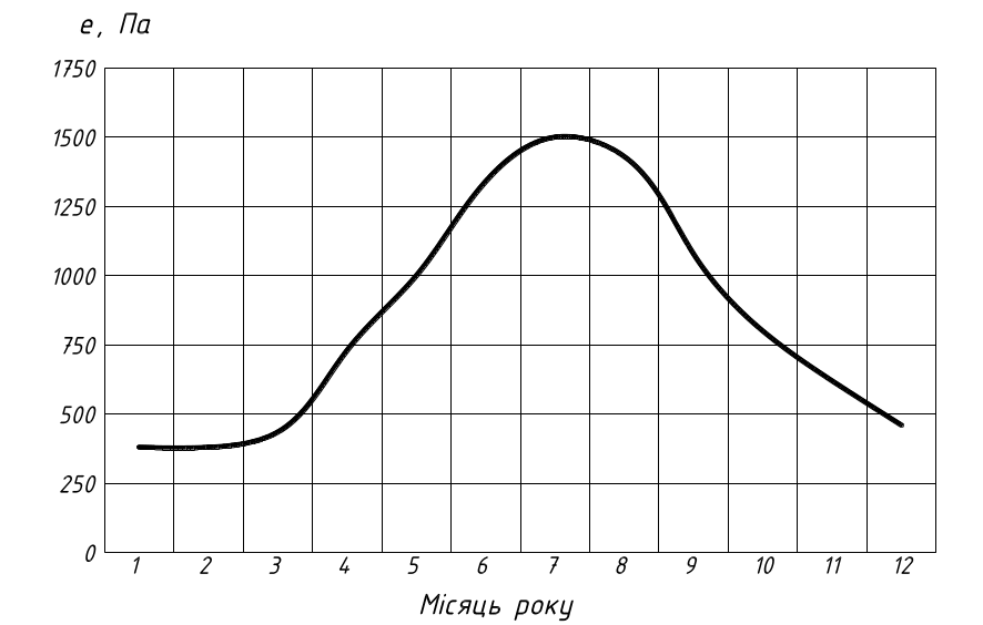 Використовуючи значення наведенні у дод.3 [2] будуємо графік зміни пружності водяної пари зовнішнього повітря на протязі року.