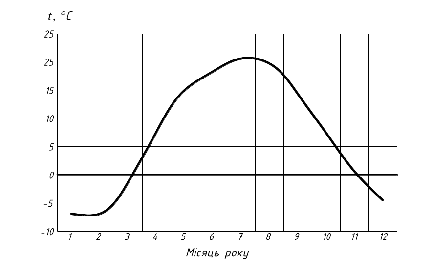 Використовуючи значення наведенні у табл. 1 [2] будуємо графік зміни середньомісячної температури зовнішнього повітря на протязі року.