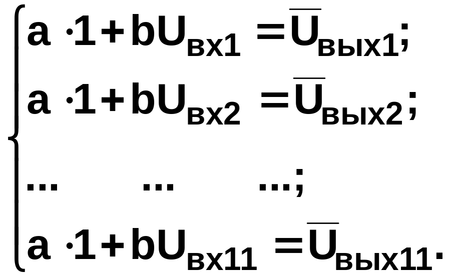 Количество условных уравнений избыточно (n = 11), так как превышает число неизвестных (коэффициенты a и b). Поэтому необходимо перейти к системе нормальных уравнений, для которой количество неизвестных и количество уравнений равно. Решение условных уравнений должно быть таким, чтобы сумма квадратов невязок была минимальной (постулат Лежандра):