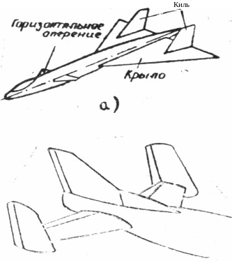 На самолетах типа «утка» (рис. 4.2.а) горизонтальное оперение располагается впереди крыла. При такой схеме оперение более эффективно, чем оперение, расположенное за крылом. Вертикальное оперение обычно располагают на фюзеляже. Если потребные размеры оперения получаются большими, применяют двух и трехкилевые схемы (рис. 4.2. а, б). У самолетов без горизонтального оперения или выполненных по схеме «утка» вертикальное оперение может устанавливаться на крыле (рис.4.2. а). На высотных самолетах с большими сверхзвуковыми скоростями полета часть вертикального оперения выносят вниз под фюзеляж (рис.4.3. а).