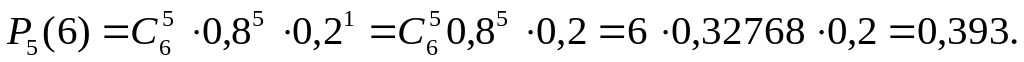 Приклад. Ймовірність влучення при одному пострілі дорівнює 0,8. Знайти ймовірність 5 влучень при 6 пострілах.
