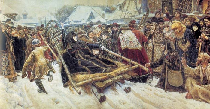Тема запозичена з історії 17 століття, з часів церковного розколу. Заможна бояриня Морозова, старообрядниця, після мук, відправляється у заслання на північ. Вдалося передати сліпий фанатизм, пристрастну впевненість Морозової та різну реакцію на неї навколишніх. Дуже добре передана атмосфера пізньої зими. |