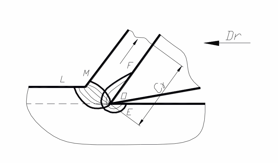 Рис. 5. Зоны деформаций при резании: зона OLM – зона основных пластических деформаций, образуется в результате сжатия металла (OL - начальная граница зоны стружкообразования, где частицы металла получают первую деформацию, OM – конечная граница зоны стружкообразования, здесь частицы металла получают наибольшую деформацию и имеют свойства, характерные для готовой стружки); зона OEF – зона дополнительных пластических деформаций, протяженность ее приближенно равна половине полной длины контакта стружки с передней поверхностью РИ – Сγ (причиной образования этой зоны являются процессы трения на передней поверхности РИ)