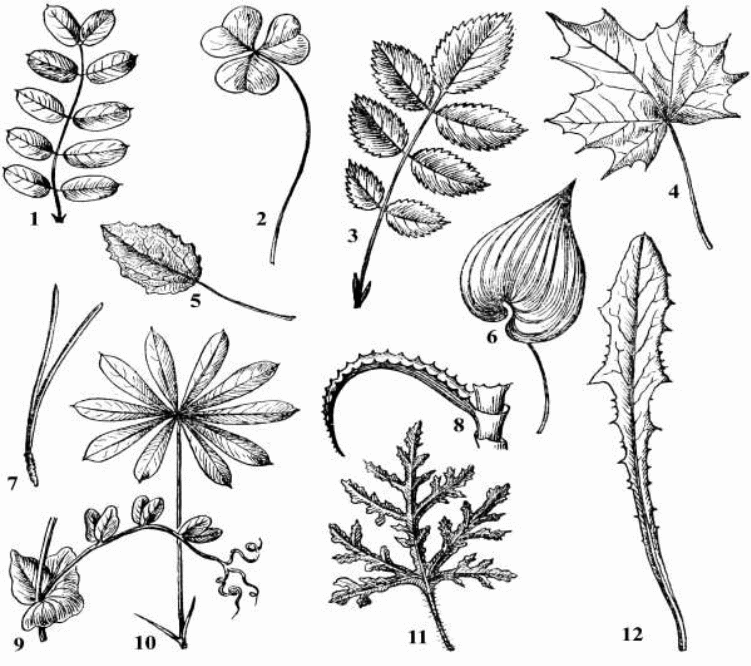 Задание 1. [mах 3 балла] На рисунке изображены листовые пластинки двух типов – простые (А) и сложные (Б). Соотносите их цифровые обозначения (1-12) с типом листовой пластинки, к которому они относятся.