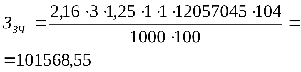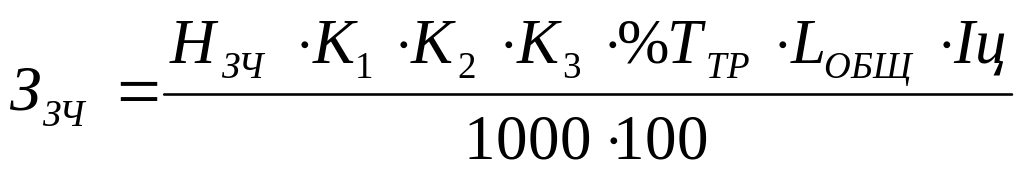 где: НЗЧ - норма затрат на запасные части на тысячу км пробега, руб.; %ТР ТР- процент трудоёмкости работ по текущему ремонту выполняемых на участке, %; К1 - коэффициент, учитывающий категорию условий эксплуатации подвижного состава; К2 - коэффициент, учитывающий модификацию подвижного состава; К3 - коэффициент, учитывающий природно-климатические условия эксплуатации подвижного состава Iц -индекс цен; НЗЧЗИЛ – 2,96 НЗЧГАЗ – 2,16 НЗЧМАЗ –5,02 |