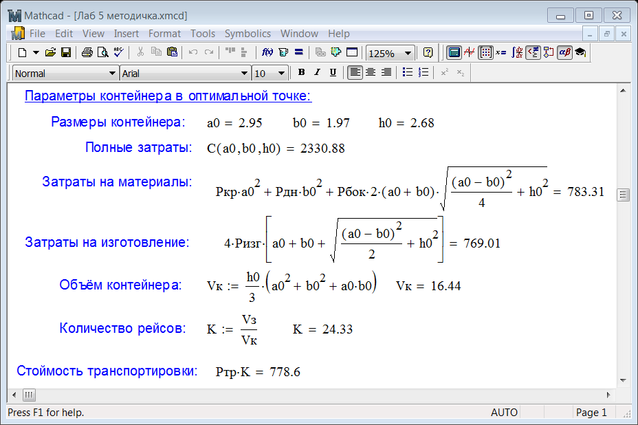 Критерий оптимизации – величина полных затрат на изготовление контейнера и транспортировку зерна с его помощью: C, у.е. При этом полная величина затрат будет зависеть: