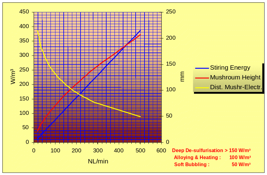 Перемешивание выполняется инертным газом (азотом/аргоном), который подается через один или два продувочных блока в днище ковша, в зависимости от его вместимости (1 блок: < 100 т / 2 блока: объем ковша 100 т). Небольшие газовые пузыри, образующиеся на выходе продувочного блока, расширяются вследствие нагрева газа (изобарическое расширение) и увеличиваются в объеме при выходе на поверхность по причине снижения ферростатического давления (изотермическое расширение). На рисунке ниже представлена зависимость энергии перемешивания от расхода газа, используемого для перемешивания.