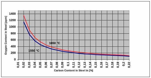 Кислород в стали: Содержание кислорода в стали определяется, в основном, сталеплавильным процессом (т.е. выплавка в конвертере/ДСП) и температурой стали. Как показывают опыты, проведенные Вейчером и Гамильтоном, существует тесная связь между углеродом и кислородом: