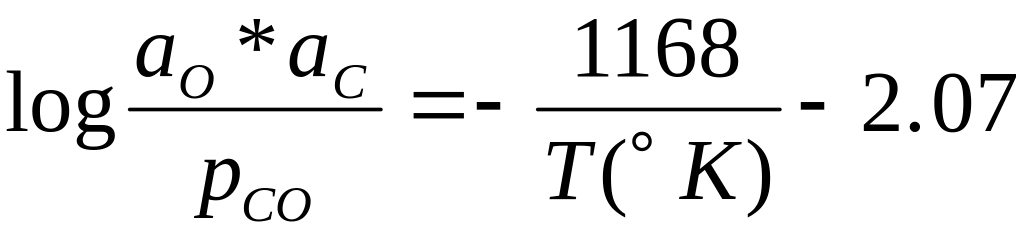 Ниже приведены константы равновесия реакции C~O для разных температур, а также показано содержание свободного кислорода на основании содержания углерода в стали. Совершенно очевидно, что константы равновесия достигаются редко. Они могут поддерживаться посредством работы под пенистым шлаком и вдувания угольного порошка при работе с ровной ванной металла.