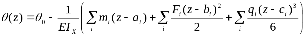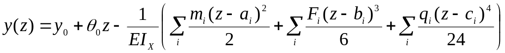 В случае действия на балку сосредоточенных моментов и сил, а также равномерно распределенной нагрузки (рис. 5.2), уравнения метода начальных параметров имеют вид: