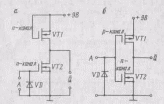 Рис. 8. Логический элемент НЕ, выполненный на МОП-транзисторах с n-каналом (а), комплиментарной паре МОП-транзисторов с n- и р-каналами (б).