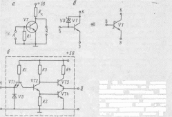 Рис. 7. Логический элемент НЕ, выполненный на обычном биполярном транзисторе (а); многоэмиттерном транзисторе с дополнительным усилителем (б); Транзистор Шоттки и его условное графическое изображение в электронных схемах (в).