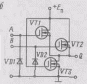 Логический элемент ИЛИ на МОП-транзисторах может быть выполнен по схеме, приведенной на рис. 6, б. В этой схеме транзисторы VT1 и VT2 включаются при подаче на их затворы положительного напряжения логической 1 и выключаются, если действует напряжение логического 0. Транзистор VT3 используется вместо резистора и постоянно открыт, что приводит к потреблению энергии питания, в то время когда открыты транзисторы VT1 и VT2.