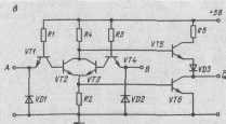 ТТЛ-вариант конструктивного исполнения схемы ИЛИ-НЕ на биполярных транзисторах приведен на рис. 10, в. Из рассмотрения рисунка видно, что схема объединяет в себе двухвходовый элемент ИЛИ (рис. 6, а) и инвертор НЕ (см. рис. 7, б). Если на входах А и В действуют напряжения логических 0, то переходы база - эмиттер транзисторов VT1 и VT4 открыты и через них протекает ток, минуя переходы база - коллектор. Вследствие этого заперты суммирующие транзисторы VT2 и VT3. Поэтому на базу транзистора VT5 через резистор R4 подается напряжение питания, полностью его отпирающее, в результате чего на выход Q поступает положительное напряжение, соответствующее логической 1. Транзистор VT6, включенный параллельно выходу Q, при этом заперт и тока не проводит, ибо на его базу не подается напряжение (с резистора R2). Если хотя бы на одном из входов А или В действует напряжение логической 1, один из суммирующих транзисторов VT2 или VT3 отпирается, напряжение в точке соединения их коллекторов резко падает, что приводит к запиранию транзистора VT5 и на вход перестает поступать положительное напряжение. При этом оказывается открытым транзистор VT6 шунтирующий своим малым сопротивлением выход, поскольку на его базу начинает подаваться напряжение, снимаемое с резистора R2, включенного в цепь эмиттеров суммирующих транзисторов VT2, VT3 (один из которых проводит ток). Таким образом, схема работает в полном соответствии с табл. 5. Условное изображения логического элемента ИЛИ-НЕ дана на рис. 9, г.