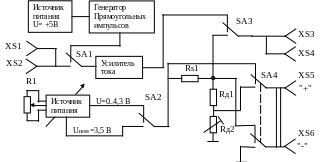 Электрическая структурная схема лабораторного блока изображена на рисунке .Генератор прямоугольных импульсов, питаемый от источника питания стабилизированного напряжения величиной 5 В, генерирует колебания ("меандр") последовательность прямоугольных импульсов с частотой 1КГц. Усилитель тока служит для повышения нагрузочной способности генератора прямоугольных импульсов, либо внешнего модулятора.