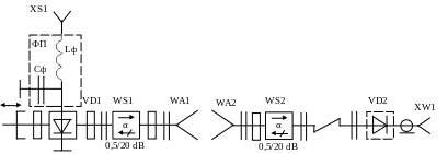 Вентили в передатчике и приемнике используются для согласования антенн со входами генератора на диоде Ганна волноводной конструкции и детекторной камерой диода VD2 приемника соответственно.