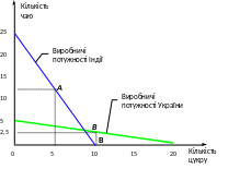 Розглянемо положення теорії А.Сміта на умовному прикладі взаємної торгівлі двох країн - України та Індії та двох видів товарів - цукру та чаю. Виробничі можливості України та Індії при абсолютній перевазі з урахуванням зроблених припущень представлені у табл. 3.2 та на рис. 3.1.