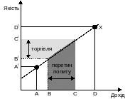 На рис. 3.7 пряма Х зображує залежність між рівнем доходу та якістю товарів, що споживаються. Нахил цієї прямої Х свідчить, що чим вище рівень доходу, тим більш якісний товар купує споживач. Припустимо, що існує дві країни - країна 1 та країна 2. Дохід мешканців першої країни знаходиться у проміжку від А (мінімальний дохід) до С (максимальний дохід), а якість товарів, які вони купують при такому доході - у проміжку від А/ (мінімальна якість) до С/ (максимальна якість). Дохід мешканців другої країни дещо вище, ніж першої, і знаходиться у проміжку від В (мінімальний дохід) до D (максимальний дохід), а якість товарів, які вони купують при такому доході - у проміжку від В/ (мінімальна якість) до D/ (максимальна якість). Торгівля між країнами 1 та 2 буде здійснюватись тими товарами, якість яких знаходиться у проміжку від В/ до С/, де вимоги щодо якості споживачів обох країн перетинаються. Чим більше споживачів у двох країнах мають однакові доходи, тим вищий рівень торгівлі. Або, інакше: чим більше перетинаються структури попиту у країні-експортері та імпортері, підкріплені високим рівнем доходу, тим вищий рівень торгівлі між ними. Це і є феномен попиту, що перетинається (overlapping demand), відкритий Стефаном Ліндером.