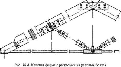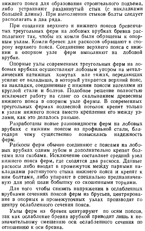 Конструкція вузлів верхнього поясу різна при розрізному і нерозрізній поясі (мал. 36.5). В обох випадках до кінців розкосів прикріплюють на болтах металеві пластинки-наконечники, що мають у вільному кінці отвір для вузлового болта. Зусилля від розкосів через платівки-наконечники сприймаються вузловим болтом, який передає їх рівнодіючу або на металевий вкладиш, а через нього на верхній пояс, або на дерев'яні або металеві бокові накладки і безпосередньо на верхній пояс. Наконечники розкосів з смугової сталі між панелями верхнього поясу і парними накладками з дерева поміщаються в спеціально обраних пазах в накладках.