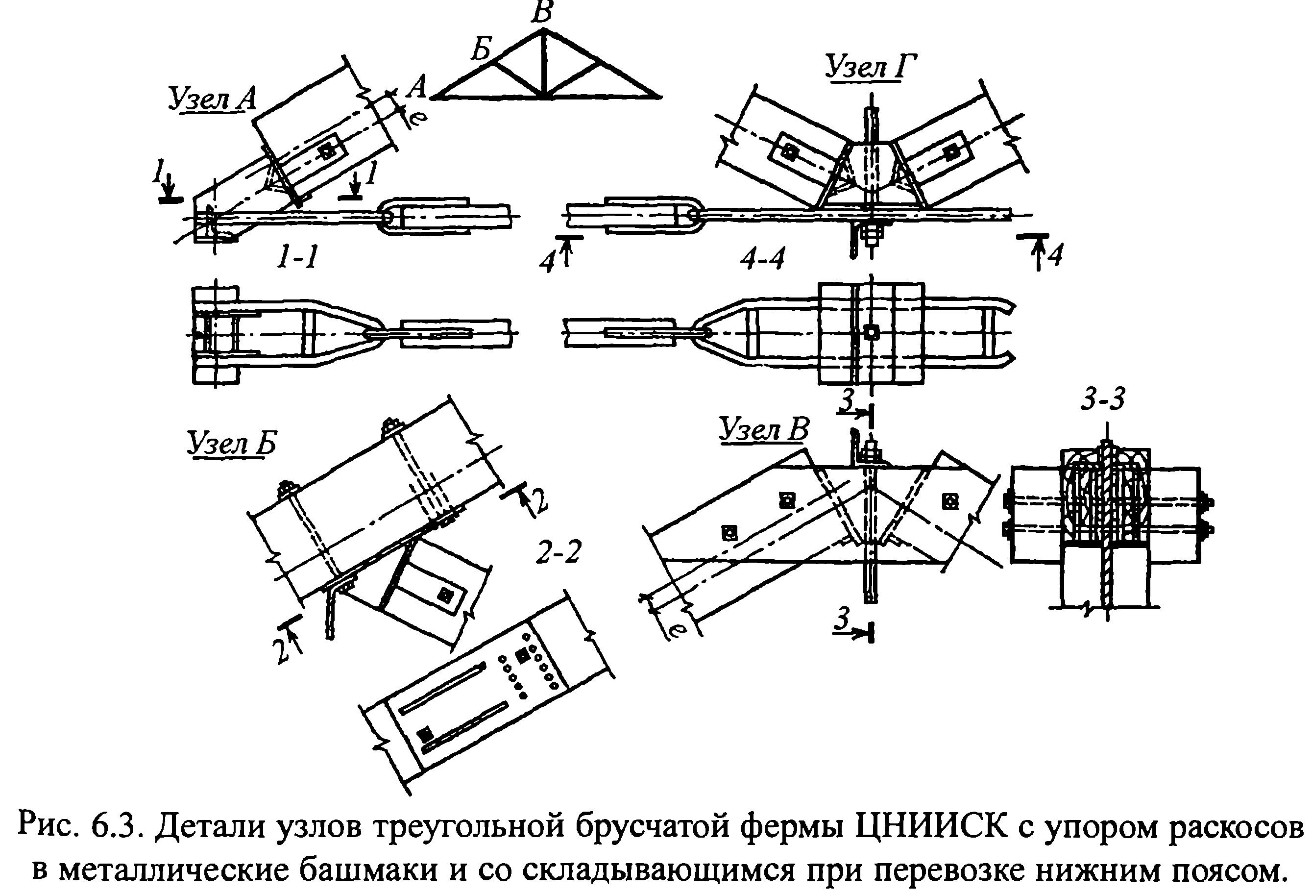 Трикутні ферми системи ЦНИИСК застосовують , як правило , для покрівель з матеріалів , що вимагають значного ухилу . Ставлення висоти ферми в конику до прольоту приймають не менше: для цільнодеревяних ферм 1/5. Для ферм з клеєним верхнім це відношення може бути знижено до 1/7 прольоту . При цьому ухил верхнього поясу і покрівлі коливається від 1:2,5 до 1:4 . Верхній пояс ферми може бути виконаний з клеєних блоків або з брусів. Нижній пояс рекомендується робити металевим з профільної або круглої сталі. Можливе застосування і дерев'яного клеєного або брусчатого нижнього поясу за умови виконання його з ретельно відібраної і належно склеєної деревини. Решітка в трикутних фермах для підвищення індустріального їх виготовлення повинна складатися з мінімального числа елементів . З цією метою рекомендують чотирьохпанельне ( по верхньому поясу ) ферми з двома стислими розкосами і відповідно з одного розтягнутої або двома стиснутими. Для чотирьохпанельної ферми із стисненими розкосами і центральної розтягнутої стійкою примикання стислих розкосів до верхніх поясів може бути виконано шляхом упору в спеціальні металеві черевики ( рис.6.3 . ) Безпосередньо у верхні пояси з відповідною їх підрізуванням ( рис. 6.4 . ) або на вузлових болтах з металевим вкладишем ( мал. 6.5 . ) .