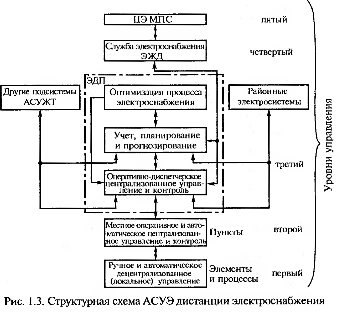 Как любая сложная система АСУЭ имеет иерархическую структуру, состоящую из отдельных подсистем (рис. 1.3), имеющих самостоятельные цели управления и общую для всей автоматизированной системы цель. Эти подсистемы находятся на разных уровнях иерархии, взаимодействуют между собой и имеют внешние связи с питающими районными энергосистемами и другими подсистемами АСУЖТ.