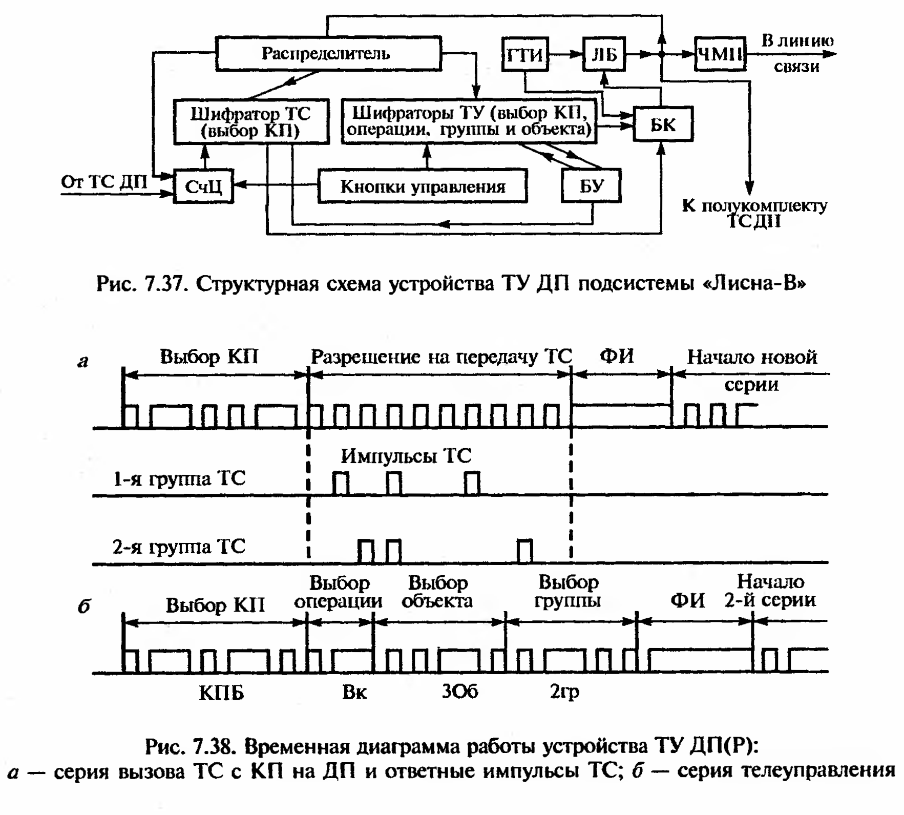Передающее устройство телеуправления ТУ ДП(Р) является частью системы «Лис- на-В», оно предназначено для образования серий импульсов, которые по каналу связи передаются на устройство ТУ-ТС контролируемого пункта. Взаимодействие между блоками при передаче команд осуществляется в основном так же, как в рассмотренном ранее устройстве «Лисна-Ч». Основной особенностью является наличие шифратора выбора КП при вызове ТС. Управление выходными цепями шифраторов выбора КП при ТС и ТУ осуществляется блоком управления БУ в зависимости от рода работы устройства (вызов ТС или передача команд ТУ) (рис. 7.37).