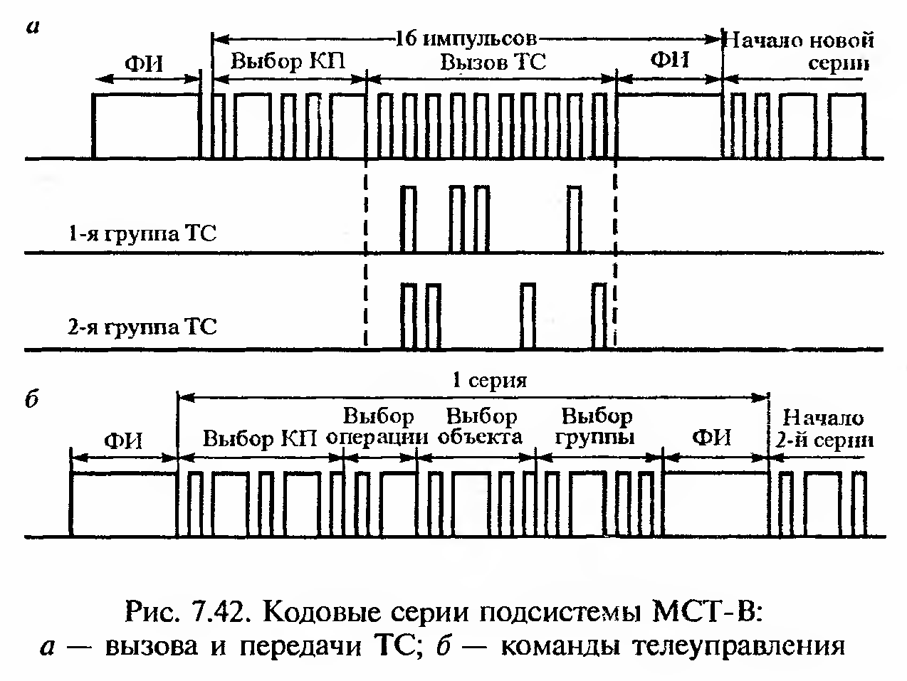 Кодовые серии ТУ и ТС подсистемы МСТ-Ч строятся по тому же принципу, что и «Лисна-Ч» (см. рис. 7.7 и 7.11). Холостая серия ТУ состоит из 30 коротких импульсов и одного сверхдлинного. Командные серии ТУ строятся точно так же, как в подсистеме
