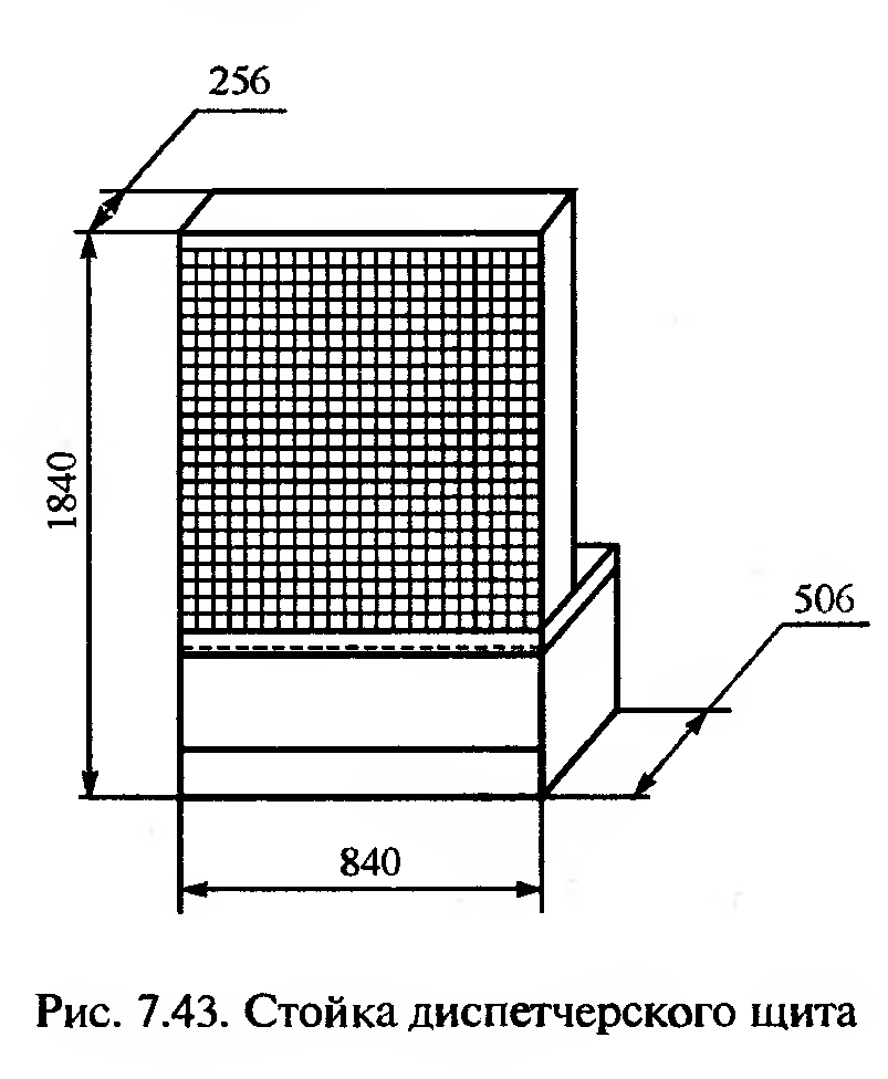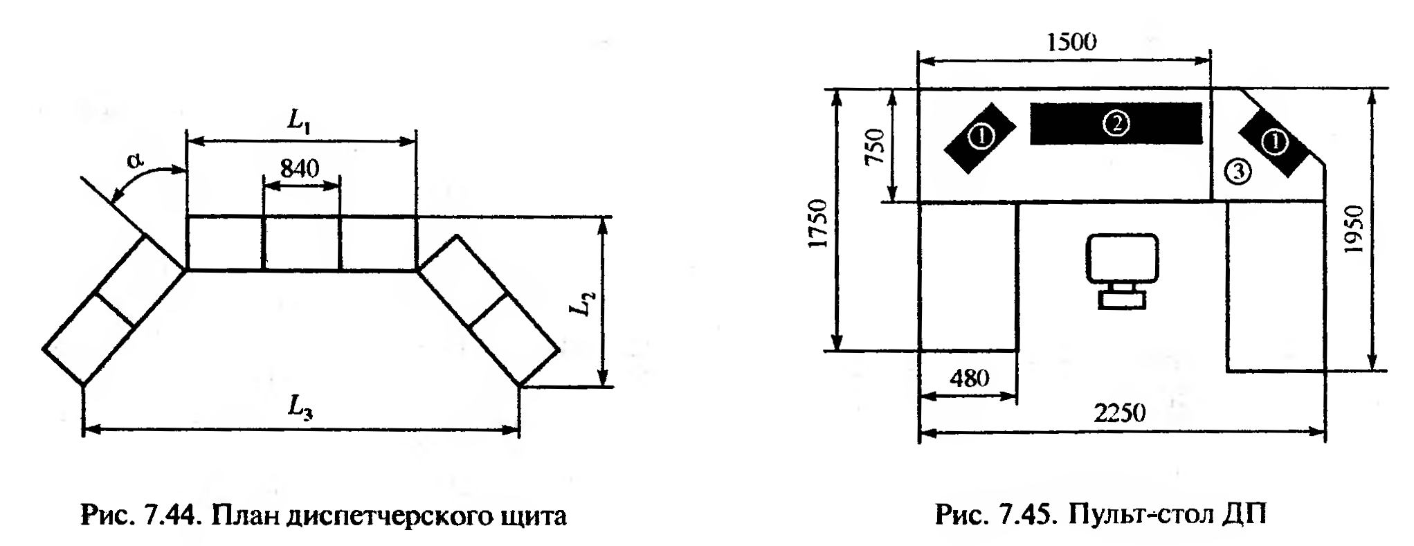 Устройства телеуправления обеих подсистем ТУ ДП и ТУ ДП(Р), а также устройство телесигнализации временной подсистемы (ТС ДПР) размещены в столе диспетчера (рис. 7.45). На столе (3) расположены пульты управления подсистем МСТ-В (1) и МСТ-Ч (2), телефон и другие устройства связи. Предусмотрено место для размещения аппаратуры АРМ диспетчера.