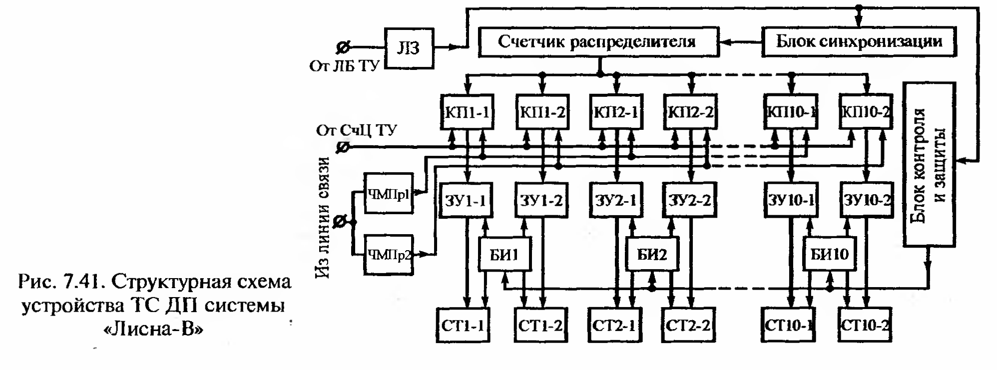 Подсистема МСТ-В по своей структуре аналогична подсистеме «Лисна-В» (см. рис. 7.5). Она рассчитана на управление с одного ДП десятью КП при использовании их полной информационной емкости. Как передающее устройство ТУ, так и приемное устройство ТС являются общими для всех КП. Передача команд ТУ производится по частотному каналу в тональном диапазоне. Прием ТС осуществляется по двум аналогичным каналам.