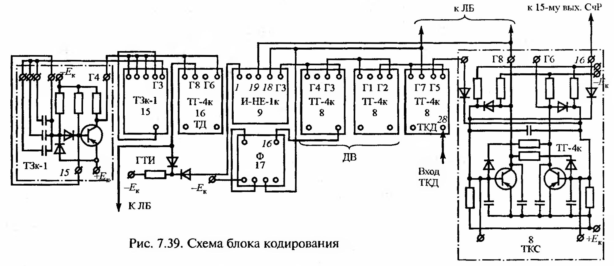 Блок кодирования имеет ряд особенностей. В отличие от передающего устройства «Лисна-Ч» сверхдлинный импульс образуется не в двух последних позициях распределителя, а в одной — 16-й, что позволяет более рационально использовать позиции распределителя для передачи информации. В связи с этим блок кодирования имеет два триггера кодирования: длинного импульса ТКД и сверхдлинного — ТКС (рис. 7.39). Триггер ТКД одновременно выполняет роль третьего разряда датчика времени.