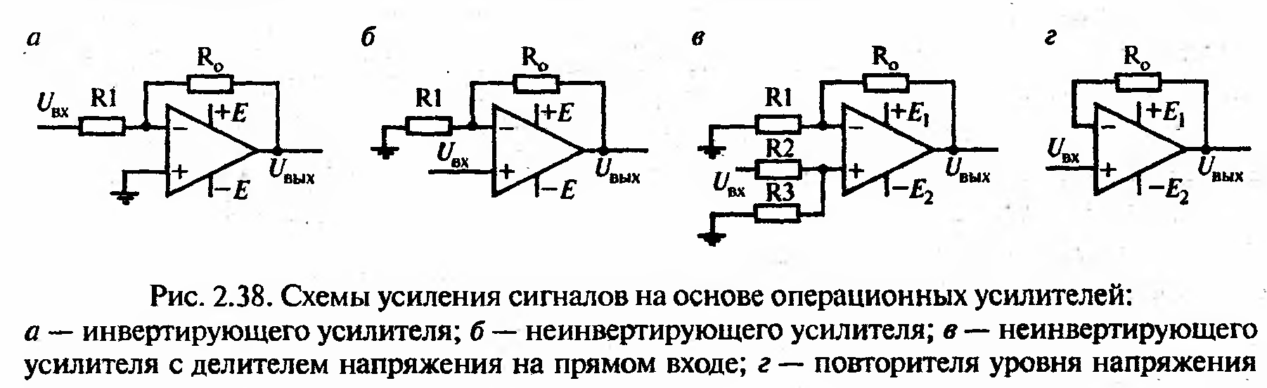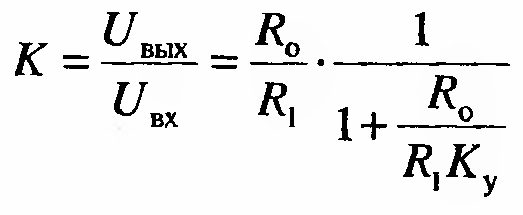 Если в схеме рис. 2.38, б принять R1 = ∞ или Rо = 0, то К= 1, т.е. получится схема повторителя напряжения (рис. 2.38, г).