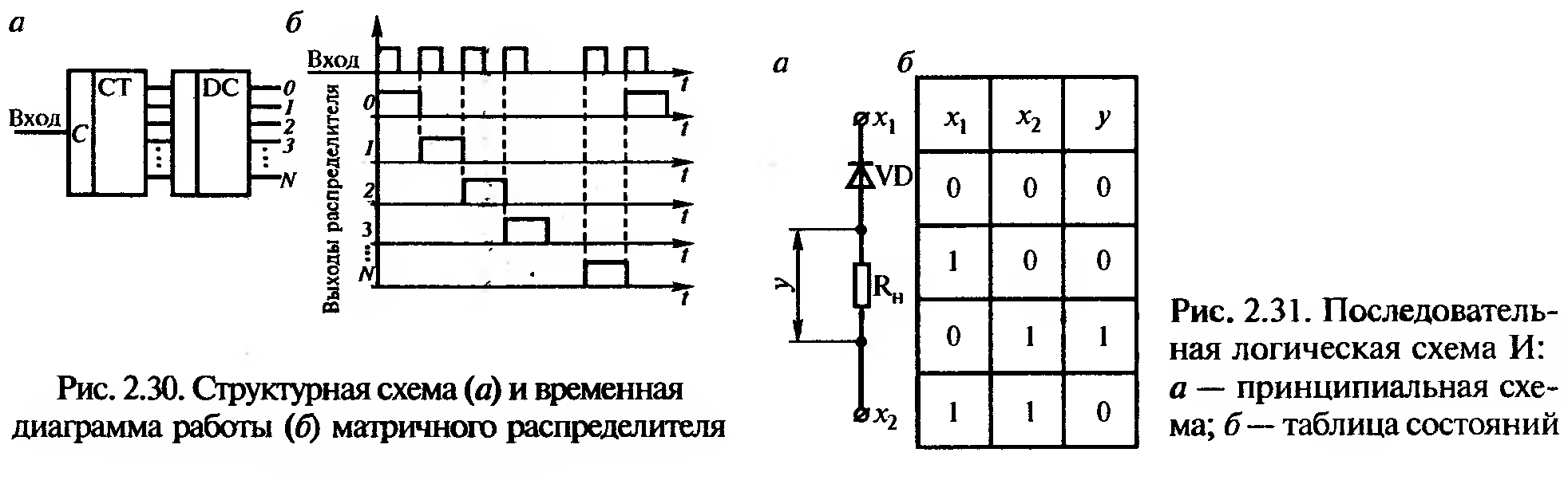 В распределителях могут быть использованы одно- или многоступенчатые дешифраторы. Одноступенчатые дешифраторы в распределителях применяются при числе выходов N≤16 (реже при N= 32). При большем числе выходов в распределителях используются многоступенчатые дешифраторы, позволяющие значительно уменьшить число логических элементов. Так в распределителе с двухразрядным счетчиком применяются дешифраторы с последовательными схемами совпадения И. Принципиальная электрическая схема последовательного логического элемента И приведена на рис. 2.31, о. Схема включает один диод VD и резистор нагрузки RH. По резистору может протекать ток только при одной комбинации входных потенциалов (сигналов): на входе x1 низкий