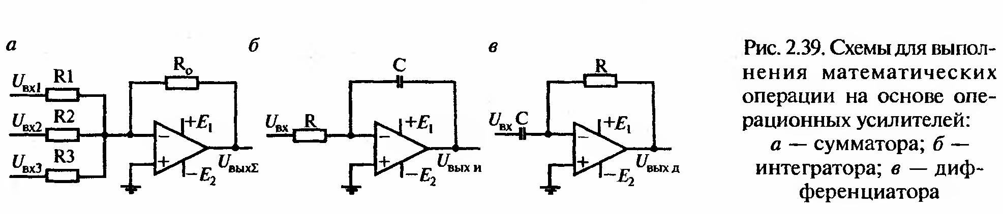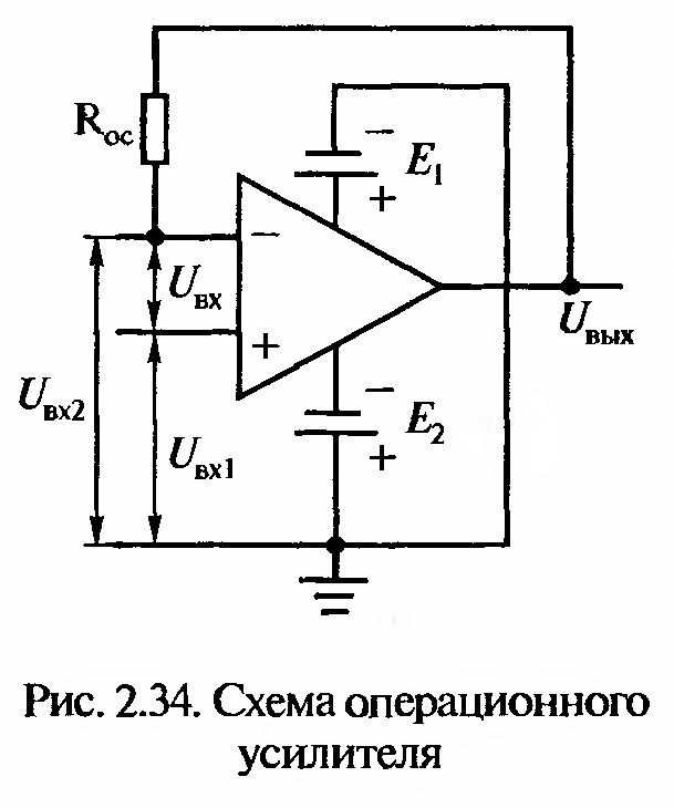 Операционный усилитель (рис. 2.34) обычно имеет дифференциальный вход (два входных зажима, на которые подаются напряжения Uвх1 и UBx2). Входное напряжение UBX является разностью напряжений Uвх1 и Uвх2. Причем каждое из входных напряжений UBx