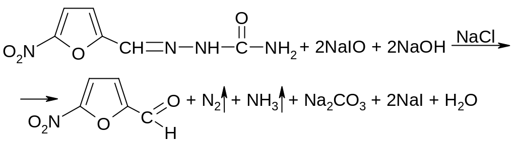 Окислительно-восстановительные реакции (образования «серебряного зеркала», с реактивом Фелинга) выполняют после щелочного гидролиза, сопровождающегося выделением альдегида – 5-нитрофурфурола.