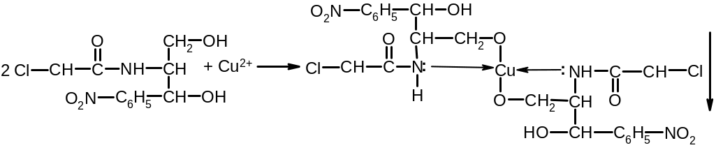 Левомицетин взаимодействует с сульфатом меди с образованием комплексного соединения синего цвета: