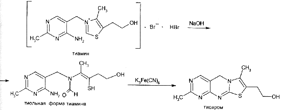 3. Химические свойства тиамина определяются главным образом ядром тиазолия, которое под влиянием гидроксидов щелочных металлов расщепляется в открытую тиольную форму, которая при действии кислоты снова образует тиамин.