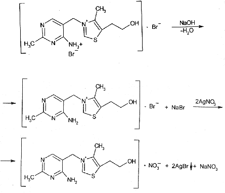 Тиамина бромид количественно определяют в водной среде способом, основанным на нейтрализации гидробромида и последующем аргентометрическом титрованиеи суммы бромид-ионов: