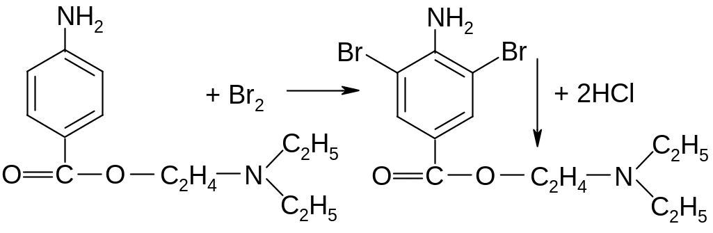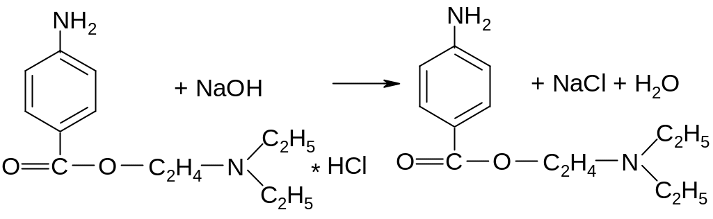 В лекарственных формах возможно алкалиметрическое титрование, т. к. новокаин является гидрохлоридом. Титрование проводят в присутствии хлороформа, который извлекает выделяющееся основание:
