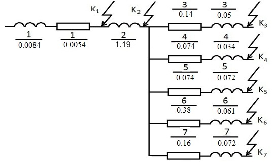 7.2 Составляем схему замещения, где каждый элемент обозначен своим номером; все магнитные связи заменяем сопротивлениями и приводим к одинаковым условиям. На схеме замещения каждое сопротивление обозначается дробью. В числитель ставится порядковый номер по однолинейной схеме, а в знаменатели – величина сопротивления в относительных единицах, приведенная к базисной мощности.