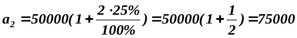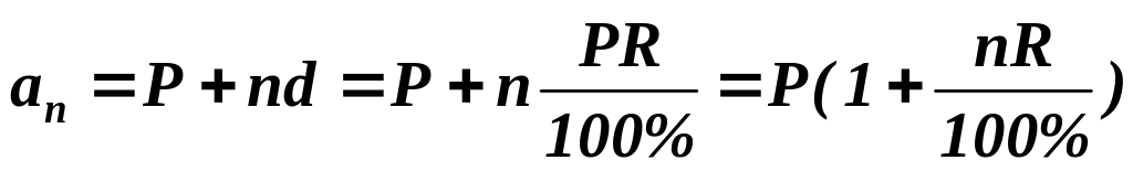 Якщо вкладення капіталу здійснюється під простий річний відсоток, то прибуток зростає на однакову величину з кожним роком: P, P+d, P+2d,…,. Ці значення утворюють арифметичну прогресію. Отже, величина капіталу P, що вкладений під простий річний відсоток R , через n років буде