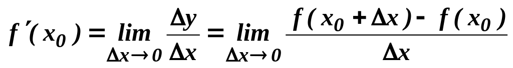 Означення. Похідною функції у = f(x) в точці х називається границя відношення приросту функції в цій точці до приросту аргументу, коли приріст аргументy прямує до нуля.