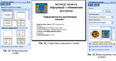 ткройте файл Методические материалы\Информатика и компьютерная техника\Модуль 3\Файлы ЛЗ-11\Курс ИКТ.doc и методом копирования через буфер обмена заполните разделы макета слайда (рис. 22).
