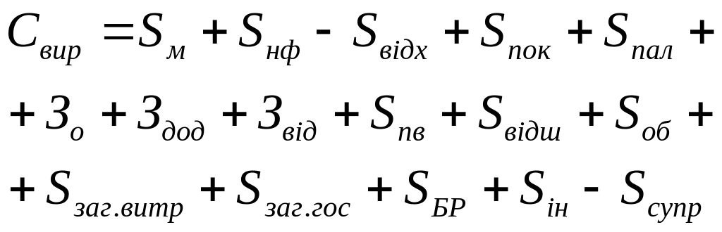 Свир – виробнича собівартість; Sм – сировина і матеріали; Sнф – напівфабрикати власного виробництва; Sвідх – повернені відходи; Sпок – покупні вироби; Sпал – паливо; Sпв – підготовка та освоєння виробництва продукції; Sвідш – відшкодування зносу спеціального обладнання; Sбр – брак; Sін – інші; Sсупр - супровідні |