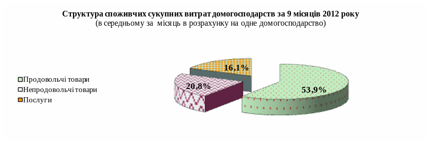 В структурі споживчих сукупних витрат (90,8 відс. сукупних витрат) питома вага продовольчих товарів за 9 місяців 2012 року склала 53,9 відсотка.