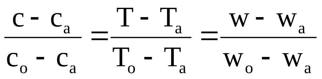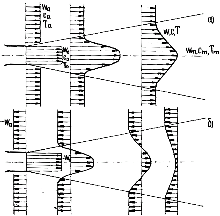 В струе могут находиться какие-либо примеси, концентрация которых со отличается от концентрации в окружающей среде са; температура струи ,Т0 также может отличаться от температуры окружающей среды Тa. В общем случае waw0, caco, TaT0. Выравнивание температур и концентраций физически происходит так же, как и выравнивание скоростей в результате турбулентного перемешивания (роль молекулярной диффузии обычно мало). Таким образом, скоростные, концентрационные и температурные поля подобны, и поэтому справедливо соотношение
