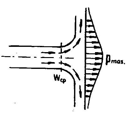 Струя, атакующая плоскость под прямым углом (рисунок 8.9) оказывает давление, максимум которого равен двум динамическим давлениям струи.