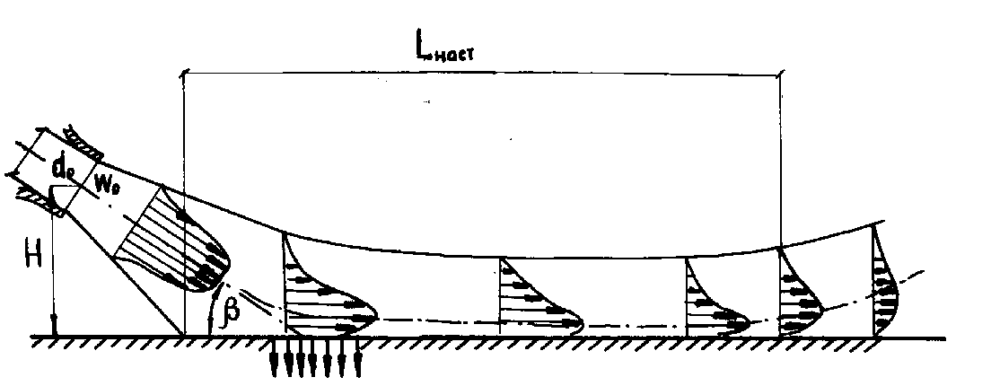 Если направить струю параллельно твердой плоскости, расположенной на небольшом расстоянии от оси струи (рисунок 8.7), то дальнобойность струи увеличится; струя, развивавшаяся до встречи с плоскостью симметрично как свободная, после удара о поверхность деформируется и «стелится» по стенке. Это свойство В.Е. Грум Гржимайло назвал настильностью. Настильность объясняется тем, что свободная поверхность струи, вовлекающая в движение новые массы, уменьшается, а затормаживающее действие присоединенной массы со стороны плоскости прекращается. Этим объясняется то, что по мере удаления от сопла максимум скоростей приближается к плоскости. В вертикальной плоскости и в горизонтальном осевом сечении струя развивается под меньшим углом, чем свободная (рисунок 8.7); угол растекания по плоскости равен 30°. Струя, развивающаяся параллельно плоскости, не оказывает на её давление.